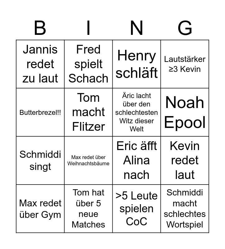 This bingo card has 20 words: Kevin redet laut, JR schlecht gelaunt, Henry schläft, Tom will jmd in Arsch ficken, Max redet über Gym, Butterbrezel!!, Tom hat über 5 neue Matches, Jannis redet zu laut, Schmiddi singt, Fred spielt Schach, Max redet über Weihnachtsbäume, Eric äfft Alina nach, Tom macht Flitzer, Schmiddi macht schlechtes Wortspiel, Äric lacht über den schlechtesten Witz dieser Welt, Deborah x Thorben, Noah Epool, Lautstärker ≥3 Kevin, >5 Leute spielen CoC and Es wird Karten gespielt.