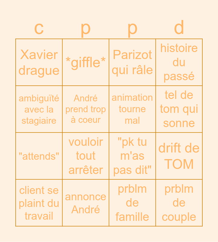 This bingo card has 16 words: annonce André, drift de TOM, Parizot qui râle, Xavier drague, "attends", *giffle*, "pk tu m'as pas dit", prblm de famille, ambiguïté avec la stagiaire, André prend trop à coeur, client se plaint du travail, histoire du passé, vouloir tout arrêter, tel de tom qui sonne, animation tourne mal and prblm de couple.