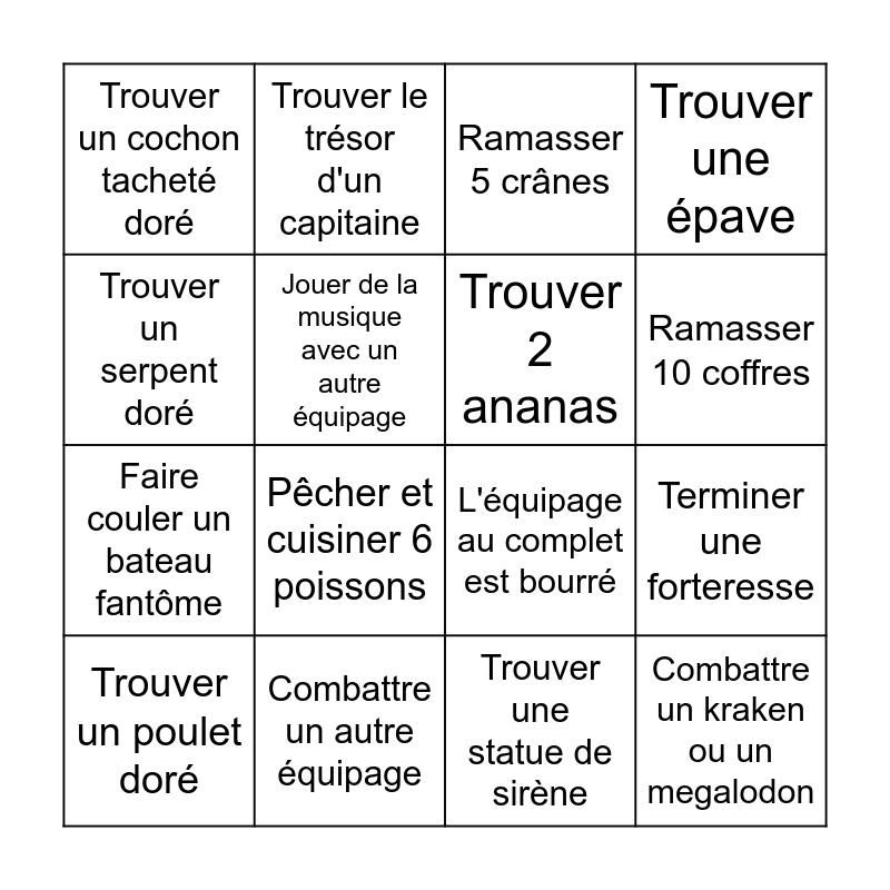 This bingo card has 16 words: Trouver un poulet doré, Combattre un autre équipage, Ramasser 5 crânes, Trouver une épave, Trouver un serpent doré, Trouver le trésor d'un capitaine, L'équipage au complet est bourré, Terminer une forteresse, Trouver un cochon tacheté doré, Jouer de la musique avec un autre équipage, Trouver une statue de sirène, Ramasser 10 coffres, Faire couler un bateau fantôme, Pêcher et cuisiner 6 poissons, Trouver 2 ananas and Combattre un kraken ou un megalodon.