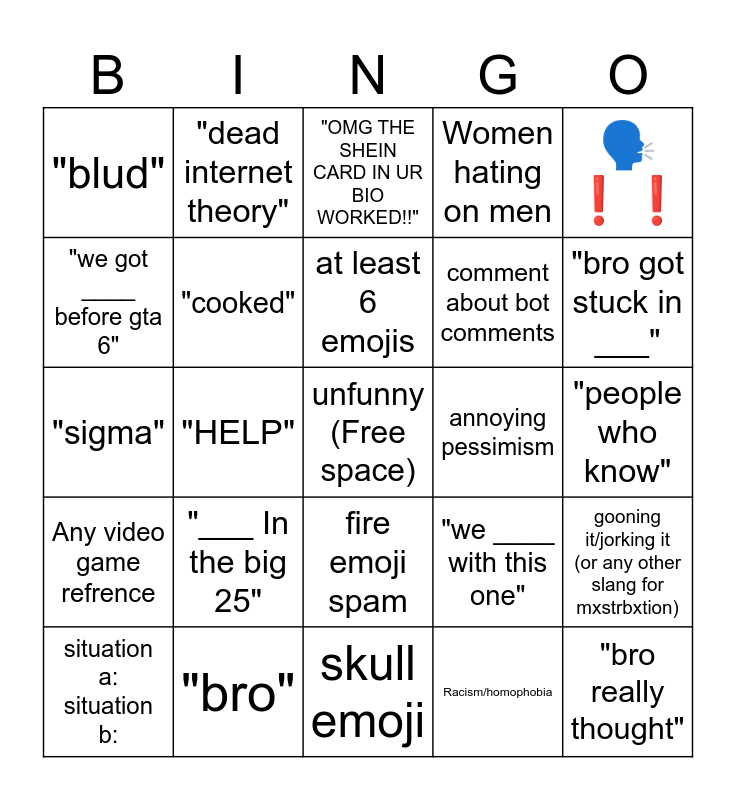 This bingo card has a free space and 24 words: "___ In the big 25", "bro", at least 6 emojis, situation a: situation b:, 🗣❗❗, "blud", "we got ____ before gta 6", "dead internet theory", annoying pessimism, fire emoji spam, comment about bot comments, "sigma", "we ____ with this one", gooning it/jorking it (or any other slang for mxstrbxtion), "cooked", Racism/homophobia, "people who know", "OMG THE SHEIN CARD IN UR BIO WORKED!!", "bro got stuck in ___", "HELP", "bro really thought", Any video game refrence, Women hating on men and skull emoji.