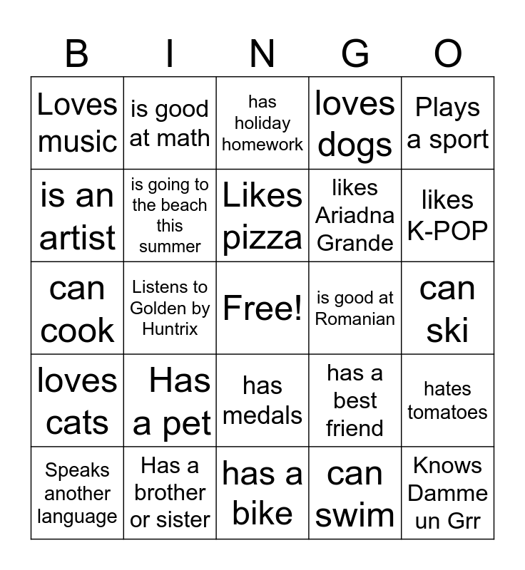 This bingo card has a free space and 24 words: Has a pet, Has a brother or sister, Likes pizza, Speaks another language, Plays a sport, Loves music, is an artist, is good at math, is good at Romanian, has medals, likes Ariadna Grande, can cook, has a best friend, hates tomatoes, is going to the beach this summer, can swim, can ski, has holiday homework, likes K-POP, Listens to Golden by Huntrix, Knows Damme un Grr, loves cats, loves dogs and has a bike.