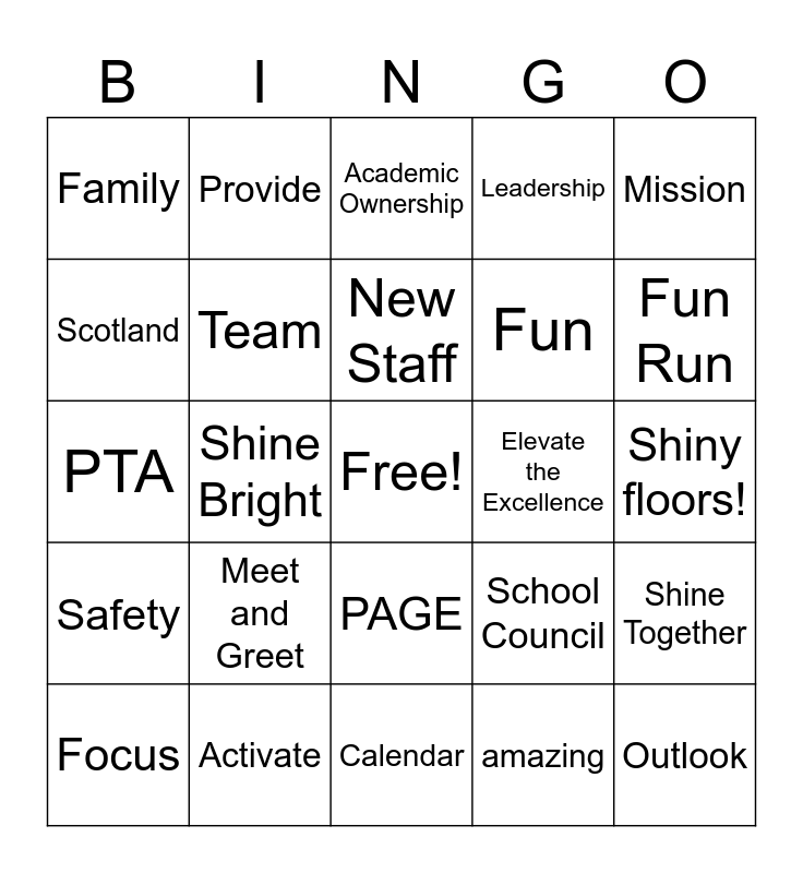 This bingo card has a free space and 34 words: CCSD, amazing, Set conditions, TKES, Safety, Team, Mission, Focus, Provide, Encourage, New Staff, Academic Ownership, PLCs, Canvas, Elevate the Excellence, Fun Run, Activate, PTA, Meet and Greet, School Council, PAGE, BOY Checklist, Family, Shiny floors!, Calendar, Outlook, Leadership, Build capacity, Fun, Scotland, Summer, Shine Bright, Shine Together and Welcome Back.