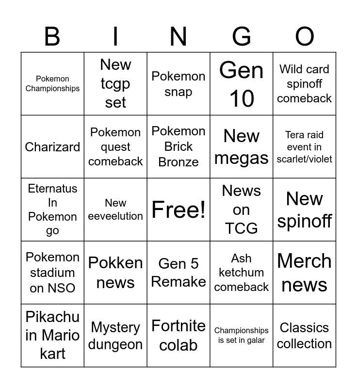 This bingo card has a free space and 24 words: Pokken news, Mystery dungeon, Pokemon Brick Bronze, Pikachu in Mario kart, Wild card spinoff comeback, Pokemon Championships, Charizard, New tcgp set, News on TCG, Gen 5 Remake, New megas, Eternatus In Pokemon go, Ash ketchum comeback, Merch news, Pokemon quest comeback, Championships is set in galar, New spinoff, Pokemon snap, Tera raid event in scarlet/violet, New eeveelution, Classics collection, Pokemon stadium on NSO, Gen 10 and Fortnite colab.