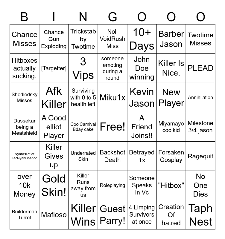 This bingo card has a free space and 48 words: Someone Speaks In Vc, Killer Is Nice., Guest Parry!, A Good elliot Player, Surviving with 0 to 5 health left, Milestone 3/4 jason, Chance Gun Exploding, Mafioso, Barber Jason, Backshot Death, Twotime Misses, Noli VoidRush Miss, New Player, Kevin Jason, over 10k Money, Miyamayo coolkid, Hitboxes actually sucking., PLEAD, "Hitbox", 10+ Days, John Doe winning, CoolCarnival Bday cake, Chance Misses, [Targetter], No One Dies, 3 Vips, Annihilation, Builderman Turret, Miku1x, Afk Killer, Creation Of hatred, A Friend Joins!!, Ragequit, Gold Skin!, Dussekar being a Meatshield, Betrayed 1x, Forsaken Cosplay, Shedledsky Misses, Underrated Skin, Killer Runs away from us, NyanElliot of TacNyanChance, Taph Nest, Trickstab by Twotime, Killer Wins, someone emoting during a round, Roleplaying, Killer Gives up and 4 Limping Survivors at once.