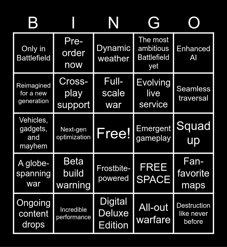 This bingo card has a free space and 25 words: Beta build warning, Digital Deluxe Edition, Full-scale war, Ongoing content drops, Enhanced AI, Only in Battlefield, Reimagined for a new generation, Pre-order now, Emergent gameplay, Frostbite-powered, Evolving live service, Vehicles, gadgets, and mayhem, FREE SPACE, Fan-favorite maps, Cross-play support, Where’s the scoreboard?, Squad up, Dynamic weather, Seamless traversal, Next-gen optimization, Destruction like never before, Incredible performance, A globe-spanning war, The most ambitious Battlefield yet and All-out warfare.