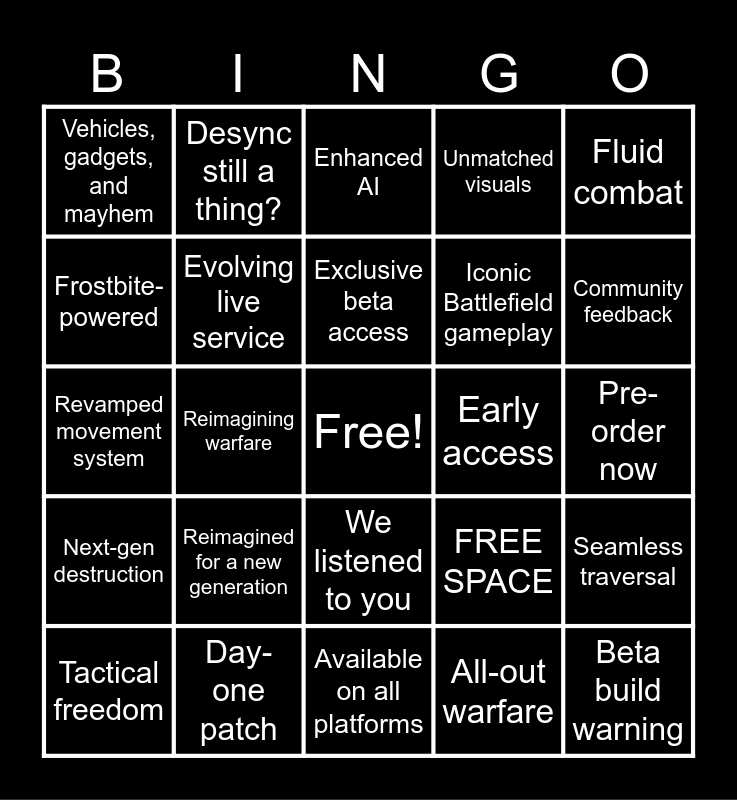 This bingo card has a free space and 25 words: Reimagined for a new generation, Available on all platforms, Exclusive beta access, Tactical freedom, Fluid combat, Vehicles, gadgets, and mayhem, Frostbite-powered, Desync still a thing?, Early access, We listened to you, Iconic Battlefield gameplay, Revamped movement system, FREE SPACE, Seamless traversal, Evolving live service, Historical authenticity, Pre-order now, Enhanced AI, Community feedback, Reimagining warfare, Beta build warning, Day-one patch, Next-gen destruction, Unmatched visuals and All-out warfare.