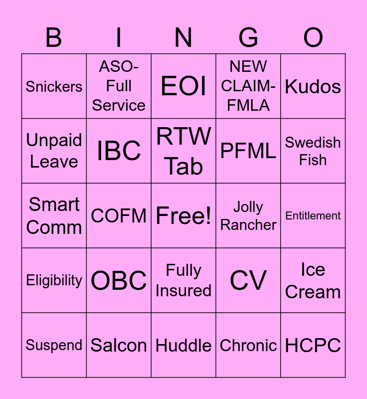 This bingo card has a free space and 92 words: Tasks, Claims, Huddle, VOC, Full File Review, Walk Up, Pend, Suspend, Approved, Terminated, Closed, Denied, State Disability, PFML, ADAAA, Kudos, EOI, Pre-ex, Part Time RTW, Accommodation, Workers' Compensation, Service Items, CM, CSR, OBC, IBC, CBR, Letter, Email, Phone, Salcon, Fully Insured, ASO-ATP, ASO-BD, ASO-Full Service, New Claim, Elig Tab, Medical Tab, RTW Tab, CV, Smart Comm, Eligibility, Entitlement, Certification, HCPC, Right's Package, 1250, 75 mile radius, 1 year service, 12 weeks, Schedule, Serious Health Condition, Treatment 2x/year, Continuous, Intermittent, FMLA, Job Protection, Unpaid Leave, OSHC, COFM, Bonding, Personal Leave, IA, F/D, Recertification, Chronic, Absence Settings, Rolling Backwards, With History, Without History, FFD, 3 day elig check, NEW CLAIM-FMLA, NEW CLAIM-STD, Strawberry Bon Bons, Nerd Clusters, Ice Cream, Sour Gummies, Starburst, Skittles, M&Ms, Jolly Rancher, Snickers, Twix, Kit Kat, Butterfinger, Reese's, Hershey's, Tootsie Roll, Almond Joy, Swedish Fish and Twizzlers.