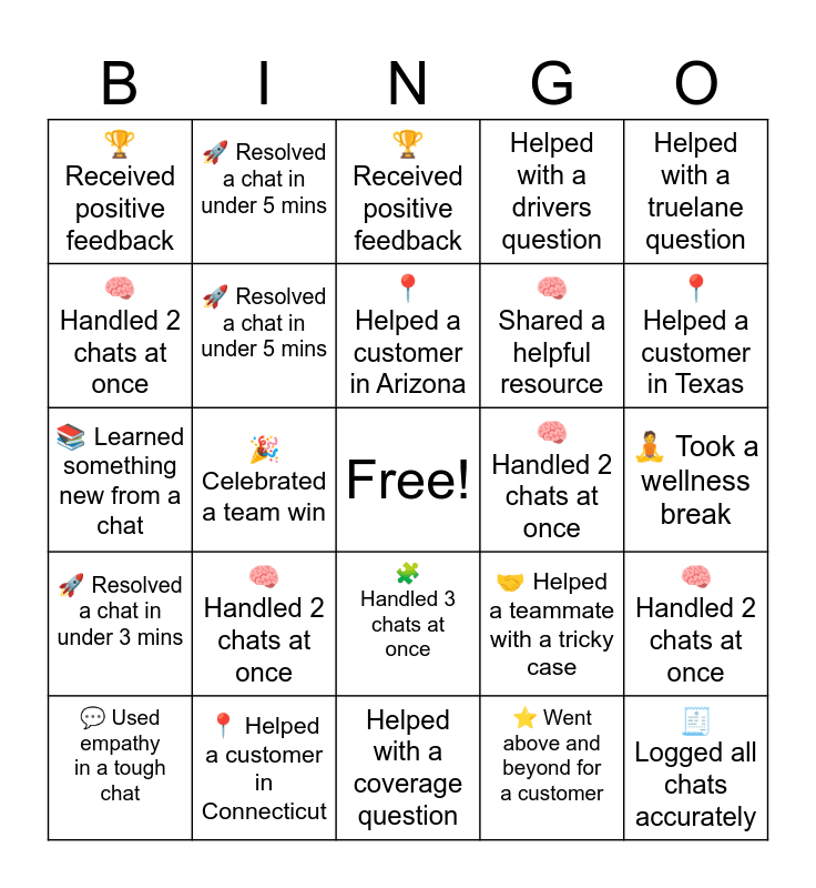 This bingo card has a free space and 24 words: ๐ง Handled 2 chats at once, ๐ Helped a customer in Connecticut, ๐ Helped a customer in Arizona, ๐ฌ Used empathy in a tough chat, Helped with a truelane question, ๐ Received positive feedback, ๐ง Handled 2 chats at once, ๐ Resolved a chat in under 5 mins, ๐ง Handled 2 chats at once, ๐งฉ Handled 3 chats at once, ๐ง Shared a helpful resource, ๐ Learned something new from a chat, ๐ค Helped a teammate with a tricky case, ๐ง Handled 2 chats at once, ๐ Resolved a chat in under 5 mins, โญ Went above and beyond for a customer, ๐ง Took a wellness break, ๐ Received positive feedback, ๐ Helped a customer in Texas, ๐ Celebrated a team win, ๐งพ Logged all chats accurately, ๐ Resolved a chat in under 3 mins, Helped with a drivers question and Helped with a coverage question.