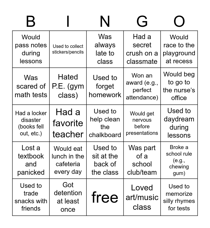 This bingo card has a free space and 24 words: Would eat lunch in the cafeteria every day, Got detention at least once, Used to forget homework, Used to trade snacks with friends, Would race to the playground at recess, Would pass notes during lessons, Was scared of math tests, Used to collect stickers/pencils, Would get nervous before presentations, Used to sit at the back of the class, Won an award (e.g., perfect attendance), Had a locker disaster (books fell out, etc.), Was part of a school club/team, Broke a school rule (e.g., chewing gum), Hated P.E. (gym class), Loved art/music class, Used to daydream during lessons, Was always late to class, Would beg to go to the nurse’s office, Had a favorite teacher, Used to memorize silly rhymes for tests, Lost a textbook and panicked, Had a secret crush on a classmate and free.