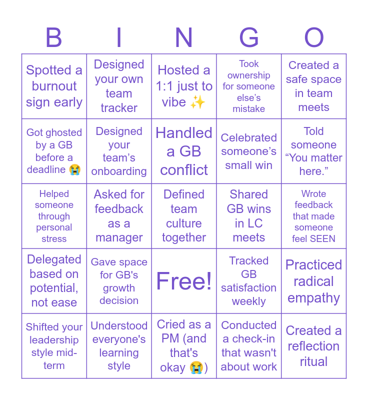 This bingo card has 26 words: Free!, Conducted a check-in that wasn't about work, Handled a GB conflict, Understood everyone's learning style, Created a safe space in team meets, Spotted a burnout sign early, Got ghosted by a GB before a deadline 😭, Designed your own team tracker, Wrote feedback that made someone feel SEEN, Tracked GB satisfaction weekly, Celebrated someone’s small win, Helped someone through personal stress, Practiced radical empathy, Shifted your leadership style mid-term, Asked for feedback as a manager, Handled “I don’t feel heard” moments, Took ownership for someone else’s mistake, Delegated based on potential, not ease, Hosted a 1:1 just to vibe ✨, Defined team culture together, Told someone “You matter here.”, Cried as a PM (and that's okay 😭), Shared GB wins in LC meets, Gave space for GB's growth decision, Designed your team’s onboarding and Created a reflection ritual.