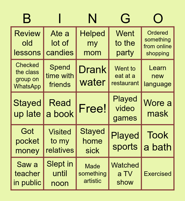 This bingo card has a free space and 29 words: Saw a teacher in public, Went on vacation, Read a book, Went shopping, Review old lessons, Helped my mom, Spend time with friends, Visited to my relatives, Played video games, Slept in until noon, Wore a mask, Exercised, Made something artistic, Watched a TV show, Learn new language, Watched a movie, Stayed home sick, Got pocket money, Ordered something from online shopping, Stayed up late, Played sports, Used social medias to talk with friends, Went to eat at a restaurant, Checked the class group on WhatsApp, Went to the party, Ate a lot of candies, Took a bath, Drank water and Talked about other people's lives.