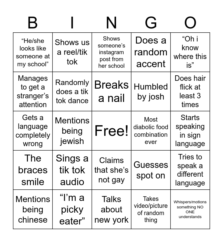 This bingo card has a free space and 29 words: Mentions being chinese, Mentions being asian, Mentions being jewish, Can’t read/recognise her own language, “He/she looks like someone at my school”, Shows someone’s instagram post from her school, Randomly does a tik tok dance, Sings a tik tok audio, Most diabolic food combination ever, “I’m a picky eater”, Starts speaking in sign language, Whispers/motions something NO ONE understands, Talks about new york, Takes video/picture of random thing, Does hair flick at least 3 times, Mentions or calls olivia, Claims that she’s not gay, The braces smile, “Oh i know where this is”, Gets a language completely wrong, Guesses spot on, Guesses in a different continent, Humbled by josh, Manages to get a stranger’s attention, Does a random accent, Shows us a reel/tik tok, Tries to speak a different language, Breaks a nail and Speaks too loud.