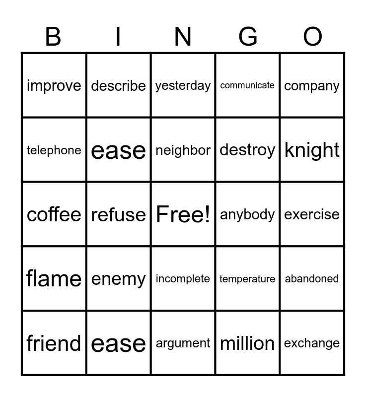 This bingo card has a free space and 24 words: friend, enemy, neighbor, million, company, improve, describe, yesterday, anybody, exercise, coffee, ease, temperature, abandoned, telephone, ease, argument, communicate, knight, flame, refuse, incomplete, destroy and exchange.