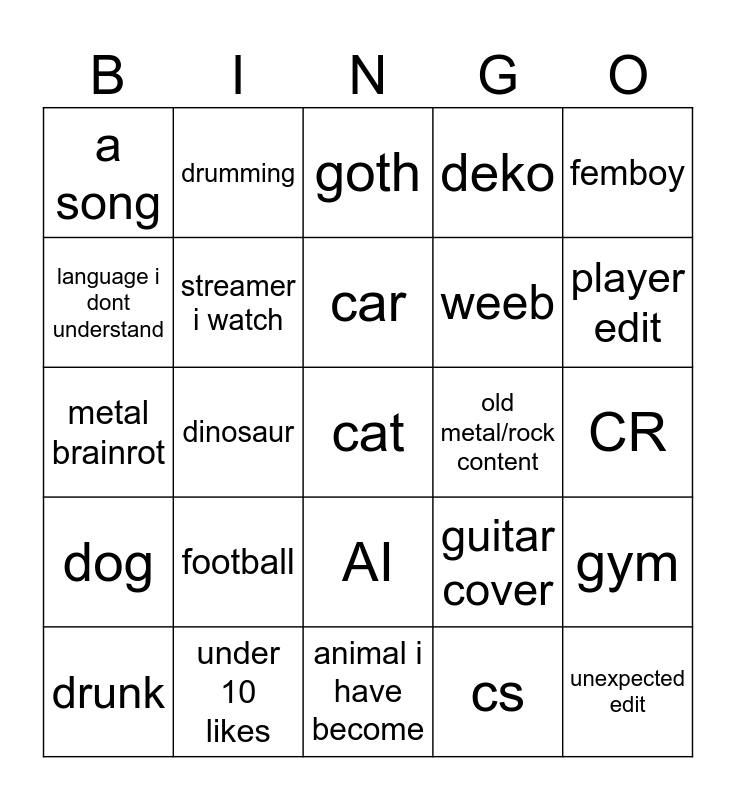 This bingo card has a free space and 24 words: football, under 10 likes, car, drunk, femboy, a song, language i dont understand, drumming, old metal/rock content, AI, weeb, metal brainrot, guitar cover, gym, streamer i watch, cs, CR, goth, player edit, dinosaur, unexpected edit, dog, deko and animal i have become.