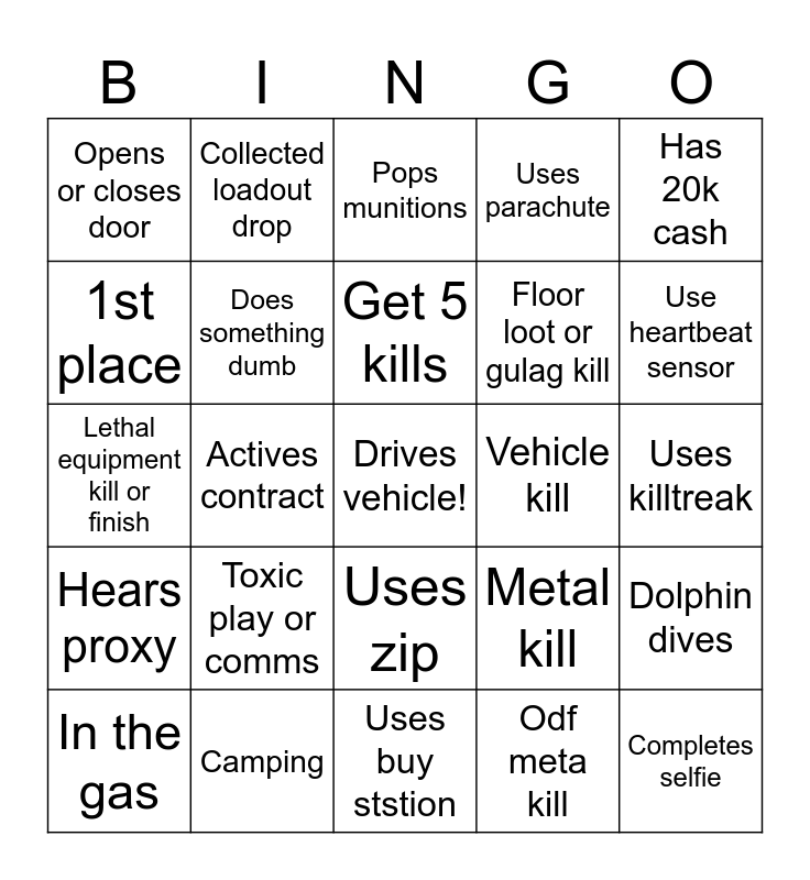 This bingo card has a free space and 24 words: Toxic play or comms, Camping, Get 5 kills, In the gas, Has 20k cash, Opens or closes door, 1st place, Collected loadout drop, Vehicle kill, Uses zip, Floor loot or gulag kill, Lethal equipment kill or finish, Metal kill, Dolphin dives, Does something dumb, Odf meta kill, Uses killtreak, Pops munitions, Use heartbeat sensor, Actives contract, Completes selfie, Hears proxy, Uses parachute and Uses buy ststion.