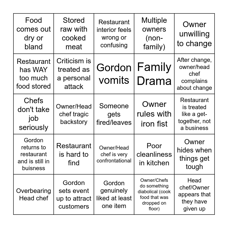 This bingo card has 25 words: Restaurant is hard to find, Gordon genuinely liked at least one item, Gordon vomits, Overbearing Head chef, Owner unwilling to change, Food comes out dry or bland, Restaurant has WAY too much food stored, Stored raw with cooked meat, Owner rules with iron fist, Owner/Head chef is very confrontational, Family Drama, Chefs don't take job seriously, Poor cleanliness in kitchen, Owner hides when things get tough, Criticism is treated as a personal attack, Head chef/Owner appears that they have given up, Restaurant is treated like a get-together, not a business, Restaurant interior feels wrong or confusing, After change, owner/head chef complains about change, Owner/Head chef tragic backstory, Someone gets fired/leaves, Gordon sets event up to attract customers, Gordon returns to restaurant and is still in buisness, Multiple owners (non-family) and Owner/Chefs do something diabolical (cook food that was dropped on floor).
