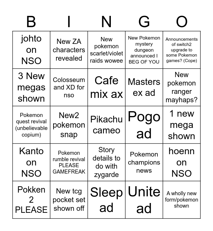 This bingo card has a free space and 24 words: Pokemon rumble revival PLEASE GAMEFREAK, New tcg pocket set shown off, Cafe mix ax, Pokken 2 PLEASE, Announcements of switch2 upgrade to some Pokemon games? (Cope), johto on NSO, 3 New megas shown, New ZA characters revealed, Pogo ad, Story details to do with zygarde, Masters ex ad, Pokemon quest revival (unbelievable copium), Pokemon champions news, hoenn on NSO, Colosseum and XD for nso, Unite ad, 1 new mega shown, New pokemon scarlet/violet raids wowee, New pokemon ranger mayhaps?, New2 pokemon snap, A wholly new form/pokemon shown, Kanto on NSO, New Pokemon mystery dungeon announced I BEG OF YOU and Sleep ad.