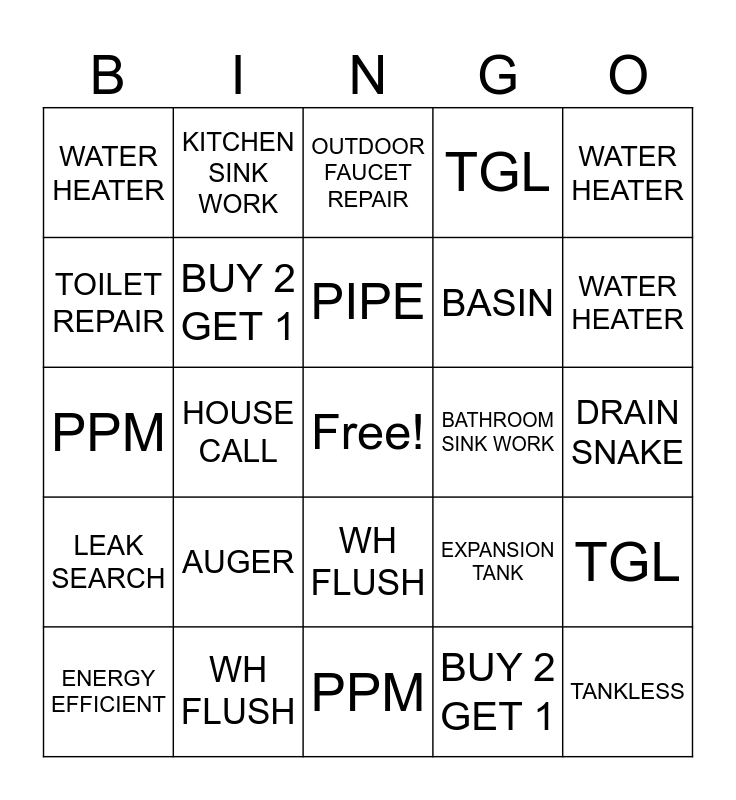 This bingo card has a free space and 27 words: WATER HEATER, WH FLUSH, PIPE, BUY 2 GET 1, WATER HEATER, TOILET REPAIR, KITCHEN SINK WORK, PPM, BATHROOM SINK WORK, TGL, LEAK SEARCH, BUY 2 GET 1, EXPANSION TANK, TANKLESS, PPM, EXPANSION TANK, OUTDOOR FAUCET REPAIR, TGL, DRAIN SNAKE, WATER HEATER, AUGER, WH FLUSH, BASIN, WATER HEATER, ENERGY EFFICIENT, HOUSE CALL and CUSTOMER.
