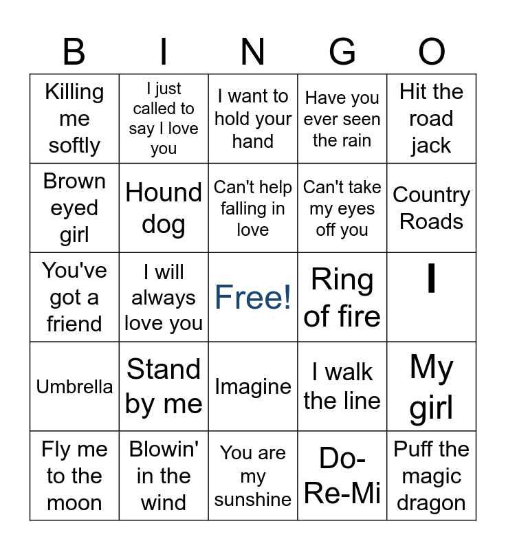 This bingo card has a free space and 24 words: Stand by me, Blowin' in the wind, Can't help falling in love, Fly me to the moon, Hit the road jack, Killing me softly, Brown eyed girl, I just called to say I love you, Ring of fire, Imagine, Can't take my eyes off you, You've got a friend, I walk the line, My girl, Hound dog, Do-Re-Mi, I, I want to hold your hand, Country Roads, I will always love you, Puff the magic dragon, Umbrella, Have you ever seen the rain and You are my sunshine.