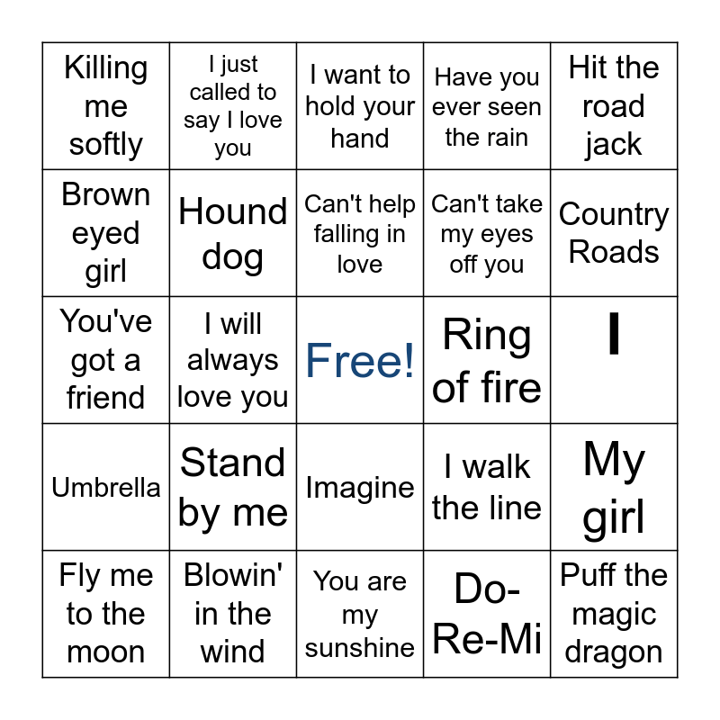 This bingo card has a free space and 24 words: Stand by me, Blowin' in the wind, Can't help falling in love, Fly me to the moon, Hit the road jack, Killing me softly, Brown eyed girl, I just called to say I love you, Ring of fire, Imagine, Can't take my eyes off you, You've got a friend, I walk the line, My girl, Hound dog, Do-Re-Mi, I, I want to hold your hand, Country Roads, I will always love you, Puff the magic dragon, Umbrella, Have you ever seen the rain and You are my sunshine.
