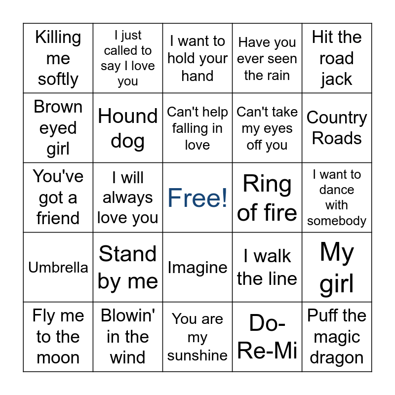 This bingo card has a free space and 24 words: Stand by me, Blowin' in the wind, Can't help falling in love, Fly me to the moon, Hit the road jack, Killing me softly, Brown eyed girl, I just called to say I love you, Ring of fire, Imagine, Can't take my eyes off you, You've got a friend, I walk the line, My girl, Hound dog, Do-Re-Mi, I want to dance with somebody, I want to hold your hand, Country Roads, I will always love you, Puff the magic dragon, Umbrella, Have you ever seen the rain and You are my sunshine.