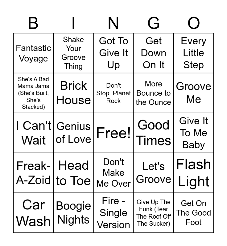 This bingo card has a free space and 39 words: Atomic Dog, Baby Be Mine, Boogie Shoes, Brick House, Car Wash, Don't Make Me Over, Don't Stop..Planet Rock, Don't Stop 'Til You Get Enough, Every Little Step, Freak-A-Zoid, Genius of Love, Get Down On It, Get On The Good Foot, Give It To Me Baby, Good Times, Head to Toe, Shining Star, Fantastic Voyage, You Dropped A Bomb On Me, Let's Groove, She's A Bad Mama Jama (She's Built, She's Stacked), Fire - Single Version, More Bounce to the Ounce, Groove Me, Ain't Nobody, Rock Steady, Funkytown, I Will Survive, Superstition, Shake Your Groove Thing, Love Train, Get Down Tonight, Got To Give It Up, Boogie Nights, Give Up The Funk (Tear The Roof Off The Sucker), Dancing Machine, Flash Light, I Can't Wait and Shake Your Body (Down to the Ground).