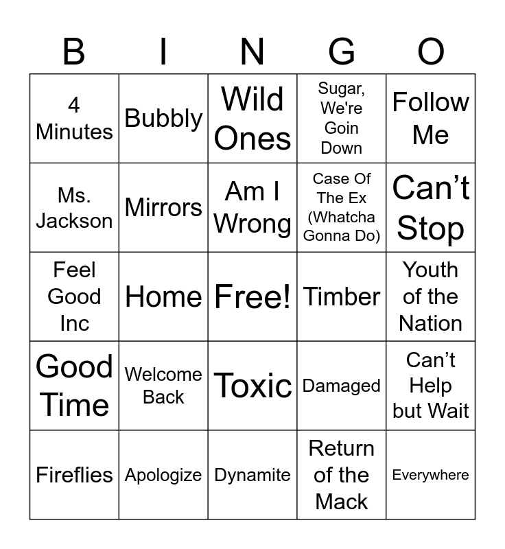 This bingo card has a free space and 71 words: Walking On A Dream, Bubbly, Just Dance, Mr. Brightside, Dynamite, So Sick, Sugar, We're Goin Down, Moves Like Jagger, Case Of The Ex (Whatcha Gonna Do), Black Betty, Fireflies, Can’t Get You out of My Head, Can’t Stop, 4 Minutes, Whatcha Say, Feel Good Inc, Damaged, Follow Me, Are You Gonna Be My Girl, Youth of the Nation, Welcome Back, Everywhere, Can’t Help but Wait, I’m Just a Kid, Untouched, Full Moon, Pinch Me, On The Floor, California Gurls, Like A G6, Apologize, Me And My Broken Heart, Stacy's Mom, My Boo, Return of the Mack, Where the Party At, Take It to da House, Ride Wit Me, Ms. Jackson, Hate It Or Love It, Toxic, Stereo Hearts, Good Time, Uptown Funk, Immortals, We Are Young, Demons, Mirrors, Best Day Of My Life, Teenage Dream, On Top Of The World, Paradise, Timber, Can't Feel My Face, Bang Bang, Irresistible, Am I Wrong, I Knew You Were Trouble., What Makes You Beautiful, Fancy, Same Old Love, Good For You, Home, Thnks fr th Mmrs, Classic, I Feel It Coming, Wild Ones, Magic, Clumsy, Safe And Sound and We R Who We R.
