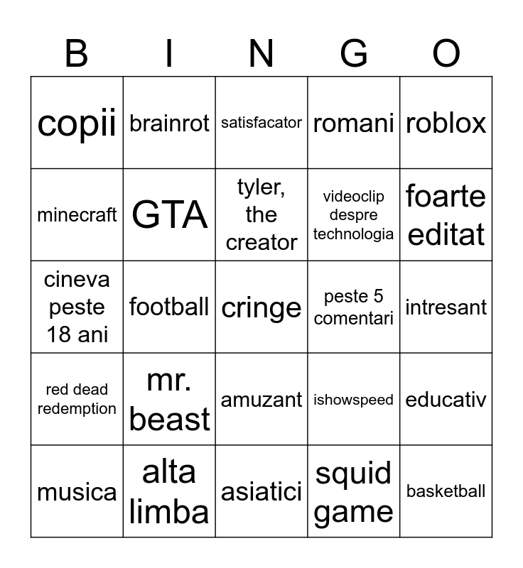 This bingo card has a free space and 24 words: mr. beast, alta limba, tyler, the creator, musica, roblox, copii, minecraft, brainrot, peste 5 comentari, amuzant, videoclip despre technologia, cineva peste 18 ani, ishowspeed, educativ, GTA, squid game, intresant, satisfacator, foarte editat, football, basketball, red dead redemption, romani and asiatici.