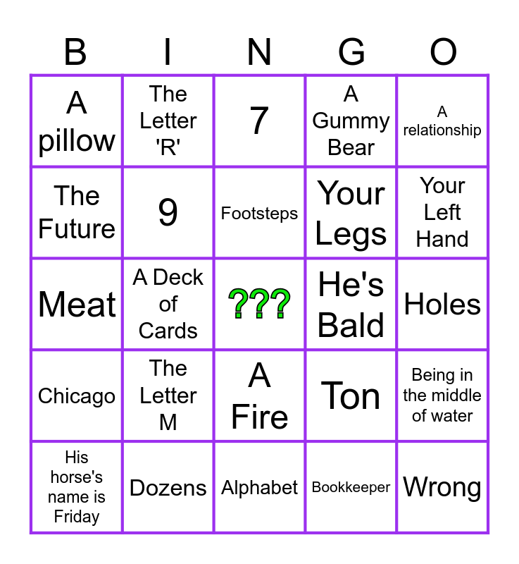 This bingo card has a free space and 25 words: The Letter M, Alphabet, Footsteps, His horse's name is Friday, A relationship, A pillow, The Future, The Letter 'R', He's Bald, A Fire, Your Legs, Meat, Ton, Being in the middle of water, 9, A sponge, Holes, 7, Your Left Hand, A Deck of Cards, Wrong, Dozens, Chicago, A Gummy Bear and Bookkeeper.