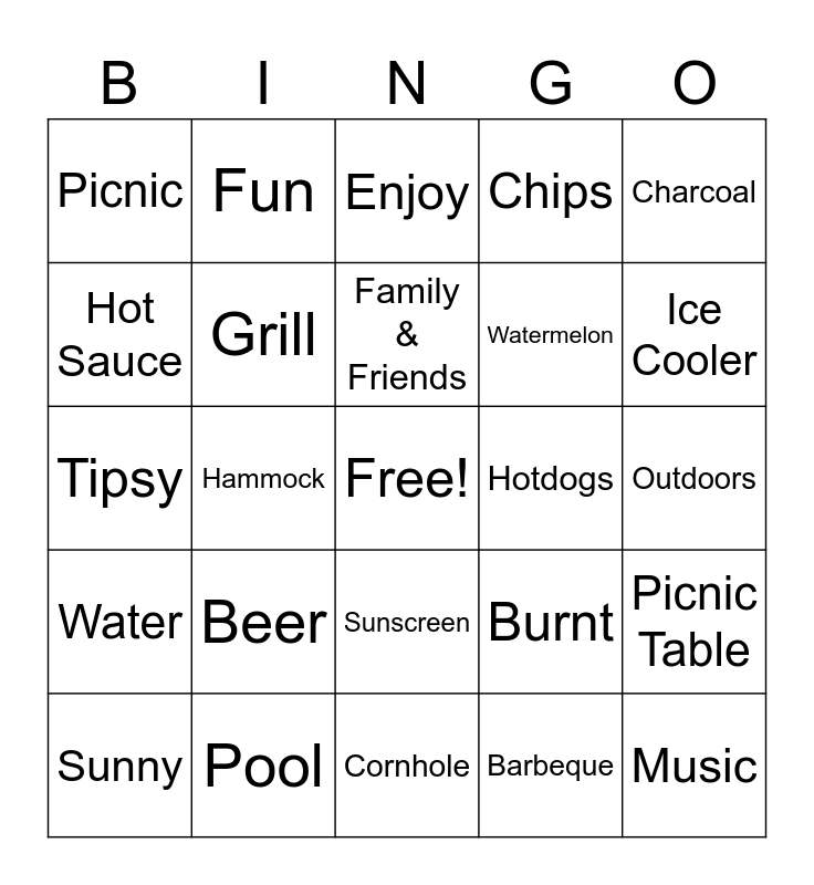 This bingo card has a free space and 34 words: Fire, Barbeque, Yard, Flowers, Water, Grill, Charcoal, Sunny, Fun, Games, Family & Friends, Enjoy, Hot, Burgers, Hotdogs, Ice Cooler, Pool, Tipsy, Beer, Burnt, Sunscreen, Backyard, Picnic, Outdoors, Cornhole, Music, Chips, Potato Salad, Watermelon, Hot Sauce, Smoke, Hammock, Picnic Table and Umbrella.