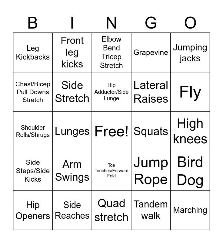 This bingo card has a free space and 46 words: Tricep Kickbacks, Marching, Arm across body Shoulder Stretch, Quad stretch, Arm Swings, Butterfly Stretch, Front leg kicks, Ankle Circles, Chest/Bicep Pull Downs Stretch, Chest Press, Side Stretch, Grapevine, Bird Dog, Jump Rope, Knee to chest stretch, Hamstring curls, Hip Adductor/Side Lunge, Squats, Mountain climbers, Jumping jacks, Lunges, Tandem walk, Leg Kickbacks, Lateral Raises, Low impact jacks, Fly, Hip Openers, Burpees, Toe Touches/Forward Fold, Side Steps/Side Kicks, One leg stand, Hip Circles, Skipping in Place, Dance in place, Arm Circles, Side Reaches, High knees, Wall Calf Stretch, Jogging in place, Calf raises, Pushups, Elbow Bend Tricep Stretch, Shoulder Rolls/Shrugs, Tree pose, Bicep Curls and Leg swings.