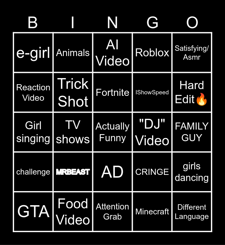 This bingo card has 25 words: MRBEAST, Attention Grab, Fortnite, GTA, Satisfying/ Asmr, e-girl, Reaction Video, Animals, "DJ" Video, AD, IShowSpeed, Girl singing, CRINGE, girls dancing, Trick Shot, Different Language, FAMILY GUY, AI Video, Hard Edit🔥, TV shows, Actually Funny, Food Video, challenge, Roblox and Minecraft.