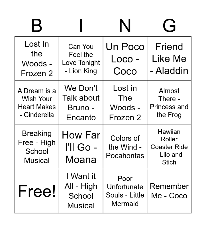 This bingo card has 23 words: Remember Me - Coco, Cruella De Vil - 101 Dalmatians, Almost There - Princess and the Frog, When Will my Life Begin - Tangled, A Dream is a Wish Your Heart Makes - Cinderella, Lost In the Woods - Frozen 2, We Don't Talk about Bruno - Encanto, Can You Feel the Love Tonight - Lion King, Free!, Love is an Open Door - Frozen, How Far I'll Go - Moana, Breaking Free - High School Musical, Cruisin For Brusin - Teen Beach Movie, We Rock - Camp Rock, I Want it All - High School Musical, What Time is it? - High School Musical, Un Poco Loco - Coco, Colors of the Wind - Pocahontas, Lost in The Woods - Frozen 2, Hawiian Roller Coaster Ride - Lilo and Stich, Friend Like Me - Aladdin, Poor Unfortunate Souls - Little Mermaid and You'll Be In My Heart - Tarzan.