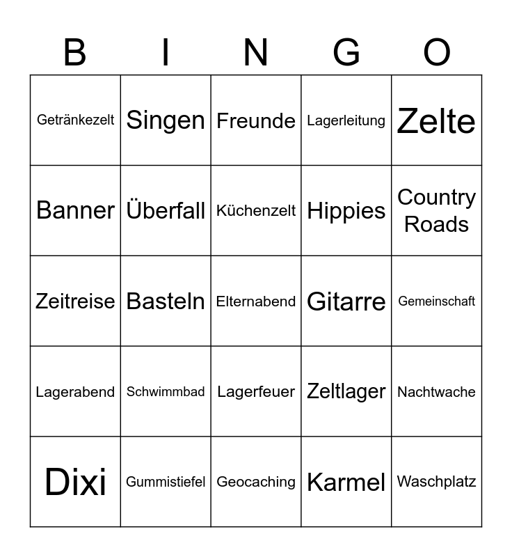 This bingo card has 25 words: Schwimmbad, Geocaching, Küchenzelt, Dixi, Zelte, Getränkezelt, Banner, Singen, Gitarre, Lagerfeuer, Hippies, Zeitreise, Zeltlager, Nachtwache, Überfall, Waschplatz, Gemeinschaft, Freunde, Country Roads, Basteln, Elternabend, Gummistiefel, Lagerabend, Lagerleitung and Karmel.
