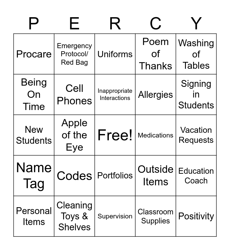 This bingo card has a free space and 24 words: Codes, Cleaning Toys & Shelves, Inappropriate Interactions, Personal Items, Washing of Tables, Procare, Being On Time, Emergency Protocol/ Red Bag, Medications, Portfolios, Allergies, New Students, Outside Items, Education Coach, Cell Phones, Classroom Supplies, Vacation Requests, Uniforms, Signing in Students, Apple of the Eye, Positivity, Name Tag, Poem of Thanks and Supervision.