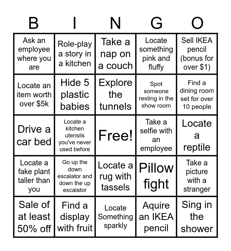 This bingo card has a free space and 24 words: Sale of at least 50% off, Go up the down escalator and down the up escalator, Explore the tunnels, Aquire an IKEA pencil, Sell IKEA pencil (bonus for over $1), Ask an employee where you are, Role-play a story in a kitchen, Take a nap on a couch, Take a selfie with an employee, Locate a reptile, Drive a car bed, Hide 5 plastic babies, Pillow fight, Take a picture with a stranger, Locate an item worth over $5k, Find a display with fruit, Locate Something sparkly, Locate something pink and fluffy, Find a dining room set for over 10 people, Locate a fake plant taller than you, Locate a kitchen utensils you've never used before, Locate a rug with tassels, Spot someone resting in the show room and Sing in the shower.