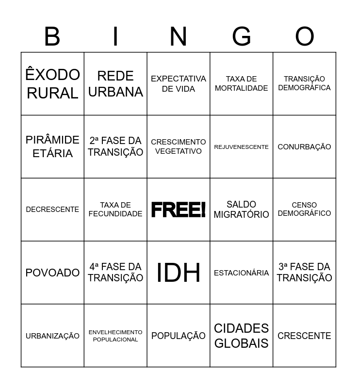This bingo card has 37 words: DENSIDADE DEMOGRÁFICA, POPULAÇÃO ABSOLUTA, 1ª FASE DA TRANSIÇÃO, 2ª FASE DA TRANSIÇÃO, 3ª FASE DA TRANSIÇÃO, 4ª FASE DA TRANSIÇÃO, CRESCIMENTO VEGETATIVO, POPULOSO, TRANSIÇÃO DEMOGRÁFICA, TAXA DE NATALIDADE, TAXA DE FECUNDIDADE, TAXA DE MORTALIDADE, FREE!, CENSO DEMOGRÁFICO, PIRÂMIDE ETÁRIA, POVOADO, POPULAÇÃO ECONOMICAMENTE ATIVA, EXPECTATIVA DE VIDA, IDH, SALDO MIGRATÓRIO, ÊXODO RURAL, CONURBAÇÃO, URBANIZAÇÃO, POPULAÇÃO, MEGACIDADES, CIDADES GLOBAIS, REDE URBANA, GLOBALIZAÇÃO, FUGA DE CÉREBROS, DESIGUALDADE, POLÍTICAS PÚBLICAS, ENVELHECIMENTO POPULACIONAL, DECRESCENTE, CRESCENTE, ESTACIONÁRIA, REJUVENESCENTE and IBGE.