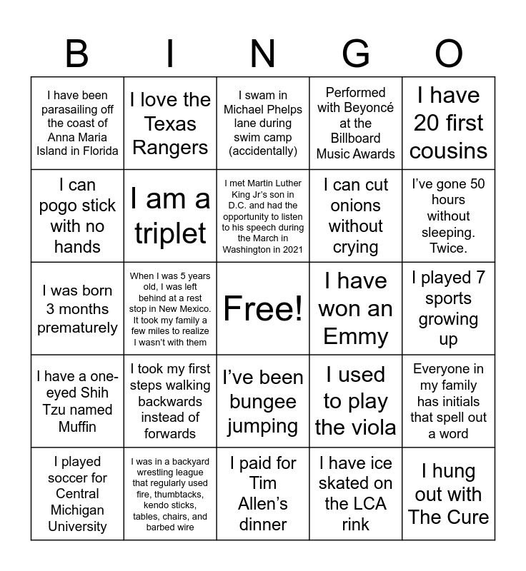 This bingo card has a free space and 56 words: My birth name on my birth certificate is Jake, not Jacob, I played soccer for Central Michigan University, Because my last name is toward the end of the alphabet, I was the last person to be handed a diploma at my high school graduation and my grandparents thought the entire audience was cheering for me because I was so popular, I have been parasailing off the coast of Anna Maria Island in Florida, I paid for Tim Allen’s dinner, I’ve lived in 4 countries, I am a triplet, I buy almost everything on Amazon, I can cut onions without crying, I am a certified graduate of Skip Barber Racing school, Performed with Beyoncé at the Billboard Music Awards, I have 5 sisters and 6 brothers. Same 2 parents., Obsessed with Formula 1, In 1962, the Beatles were turned down by nine consecutive record companies before they were signed by a very small label called Parlophone, My first dog Rey is named after the character in Star Wars and my second dog Riggs is named after the character in Lethal Weapon, I broke my collar bone when I was 5 along with an almost fully broken ankle, and a dislocated knee, I have 20 first cousins, When I was 5 years old, I was left behind at a rest stop in New Mexico. It took my family a few miles to realize I wasn’t with them, I can sing the alphabet backwards!, I hung out with The Cure, I have won an Emmy, I started my career as a music engineer, initially recording Detroit rappers and later Nashville recording artists (until I burnt out and switched careers), I used to play the viola, I swam in Michael Phelps lane during swim camp (accidentally), I grew up in a city where the homicide rate was 81 per 100,000. Thats a higher rate than any city in the US (St Louis Missouri is at 69 per 100,000), I met Martin Luther King Jr’s son in D.C. and had the opportunity to listen to his speech during the March in Washington in 2021, I used to be part of a drum circle, I used to work in the steel bar industry, I’ve gone 50 hours without sleeping. Twice., I have a three-legged cat, I danced in the Nutcracker with the Moscow Russian Ballet, I started at UWM as an underwriter, I was once an Apple Certified Support Professional, I do freelance photography as my second job, I played 7 sports growing up, I can pogo stick with no hands, I was born 3 months prematurely, I lived in Spain for 5 months, I have a one-eyed Shih Tzu named Muffin, I love the Texas Rangers, I’ve been bungee jumping, I lived in Chicago for a couple years after graduating, I have communicated with someone who is deaf and blind, I can recite the first 20 digits in the number pi, I can do the worm, I took my first steps walking backwards instead of forwards, I was in a backyard wrestling league that regularly used fire, thumbtacks, kendo sticks, tables, chairs, and barbed wire, I played in the Sugar Bowl, My name is engraved in the concrete at AT&T stadium in Texas, I am double jointed in both elbows, I have ice skated on the LCA rink, On September 4th, 2024, I successfully guessed the Wordle in one guess (of the 1,054 times I have played as of 7/17 – this is the only time I have accomplished this), I once hit two homeruns in the first inning of an IM softball game at MSU, I write songs in my free time. Play out sometimes too., Everyone in my family has initials that spell out a word and I met my boyfriend in Canada.