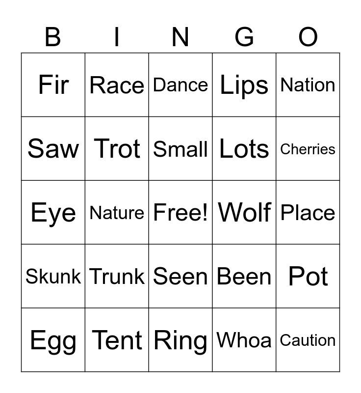 This bingo card has a free space and 24 words: Egg, Trunk, Small, Whoa, Nation, Fir, Race, Dance, Wolf, Place, Eye, Trot, Been, Pot, Saw, Tent, Ring, Lips, Cherries, Skunk, Nature, Seen, Lots and Caution.