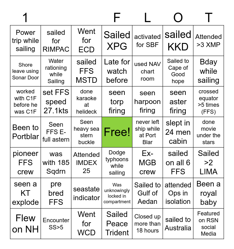 This bingo card has a free space and 48 words: Sailed to Gulf of Aedan, Sailed to Cape of Good hope, Sailed Peace Trident, Seen FFS E- full astern, done karaoke at helideck, done movie under the stars, sailed for RIMPAC, Encounter SS>5, sailed KKD, Dodge typhoons while sailing, Attended >3 XMP, Sailed XPG, seen aster firing, seen harpoon firing, seen a KT explode, slept in 24 men cabin, Shore leave using Sonar Door, Bday while sailing, attended Ops in isolation, activated for SBF, used NAV chart room, Seen heavy sea stern buckle, Power trip while sailing, Water rationing while Sailing, Been a royal baby, sailed FFS MSTD, crossed equator >5 times (FFS), Flew on NH, seen torp firing, set FFS speed 27.1kts, sailed to Australia, never left ship while at Port Blar, Sailed >2 LIMA, pre bred FFS, Been to Portblar, Ex-MGB crew, sailed on all 6 FFS, worked with C1F before he was C1F, Attended IMDEX 25, seastate indicator, pioneer FFS crew, Featured on RSN social Media, Went for ECD, Went for WCD, Late for watch before, Was unknowingly locked in compartment, was with 185 Sqdrn and Closed up more than 18 hours.