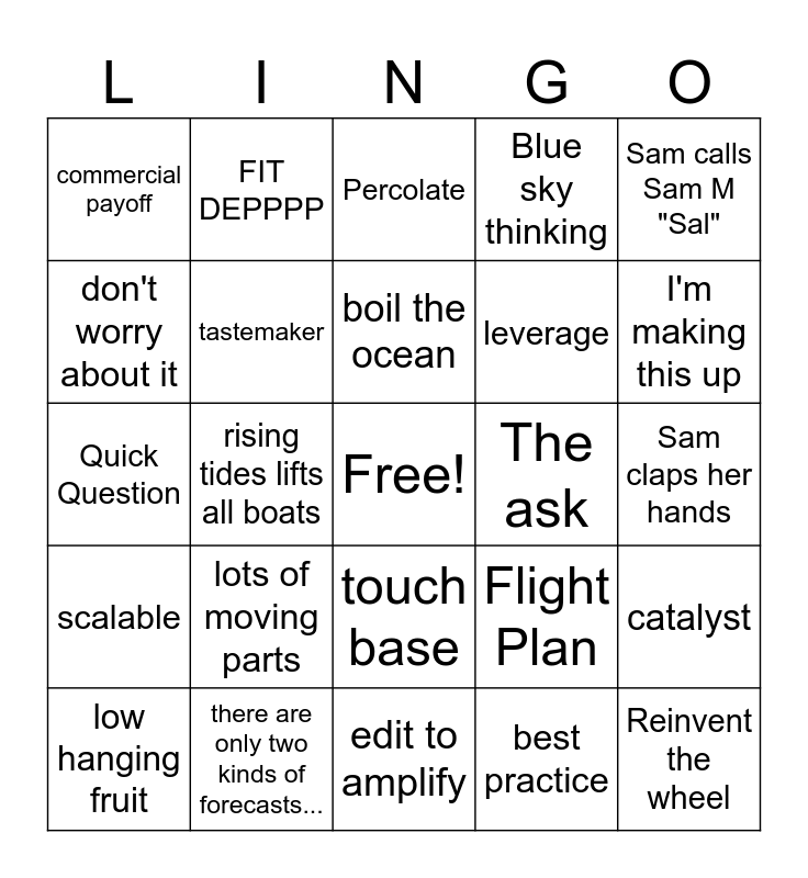 This bingo card has a free space and 24 words: lots of moving parts, there are only two kinds of forecasts..., boil the ocean, low hanging fruit, Sam calls Sam M "Sal", commercial payoff, don't worry about it, FIT DEPPPP, The ask, touch base, leverage, Quick Question, Flight Plan, catalyst, tastemaker, best practice, Sam claps her hands, Percolate, I'm making this up, rising tides lifts all boats, Reinvent the wheel, scalable, Blue sky thinking and edit to amplify.