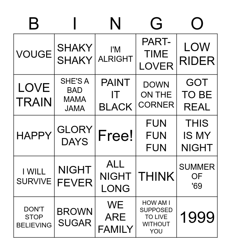 This bingo card has a free space and 29 words: DON'T STOP BELIEVING, PRETTY WOMAN, GLORY DAYS, AIN'T NOBODY, VOUGE, I'M ALRIGHT, SHE'S A BAD MAMA JAMA, NIGHT FEVER, FUN FUN FUN, BROWN SUGAR, THIS IS MY NIGHT, 1999, WE ARE FAMILY, HOW AM I SUPPOSED TO LIVE WITHOUT YOU, GOT TO BE REAL, BOOGIE SHOES, ALL NIGHT LONG, I WILL SURVIVE, LOW RIDER, HAPPY, THINK, BILLIE JEAN, DOWN ON THE CORNER, LOVE TRAIN, PART-TIME LOVER, SHAKY SHAKY, SUMMER OF '69, PAINT IT BLACK and TURN YOUR LOVE AROUND.