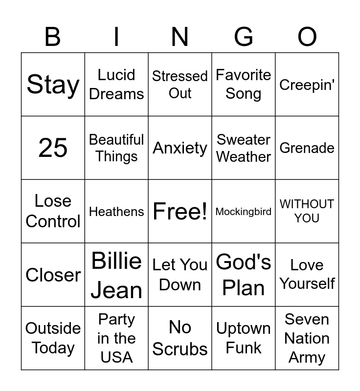This bingo card has a free space and 24 words: Billie Jean, Party in the USA, Anxiety, Outside Today, Creepin', Stay, 25, Lucid Dreams, Mockingbird, Let You Down, Sweater Weather, Lose Control, God's Plan, Love Yourself, Beautiful Things, Uptown Funk, WITHOUT YOU, Stressed Out, Grenade, Heathens, Seven Nation Army, Closer, Favorite Song and No Scrubs.