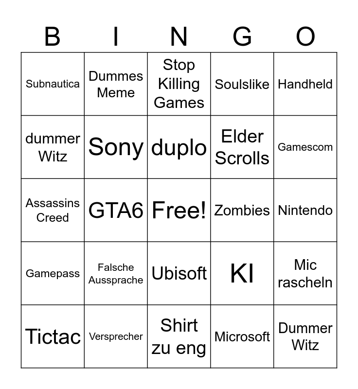 This bingo card has a free space and 24 words: Falsche Aussprache, Versprecher, duplo, Tictac, Handheld, Subnautica, dummer Witz, Dummes Meme, Zombies, Ubisoft, Elder Scrolls, Assassins Creed, KI, Mic rascheln, Sony, Microsoft, Nintendo, Stop Killing Games, Gamescom, GTA6, Dummer Witz, Gamepass, Soulslike and Shirt zu eng.