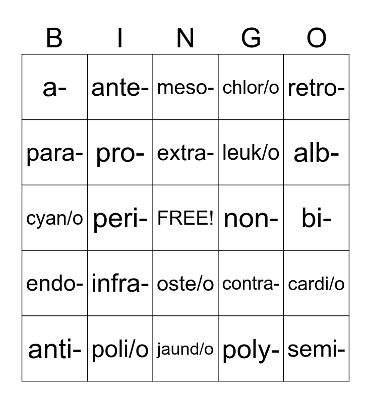 This bingo card has a free space and 24 words: infra-, poli/o, extra-, anti-, retro-, a-, para-, ante-, non-, oste/o, leuk/o, cyan/o, contra-, cardi/o, pro-, poly-, bi-, meso-, alb-, peri-, semi-, endo-, chlor/o and jaund/o.