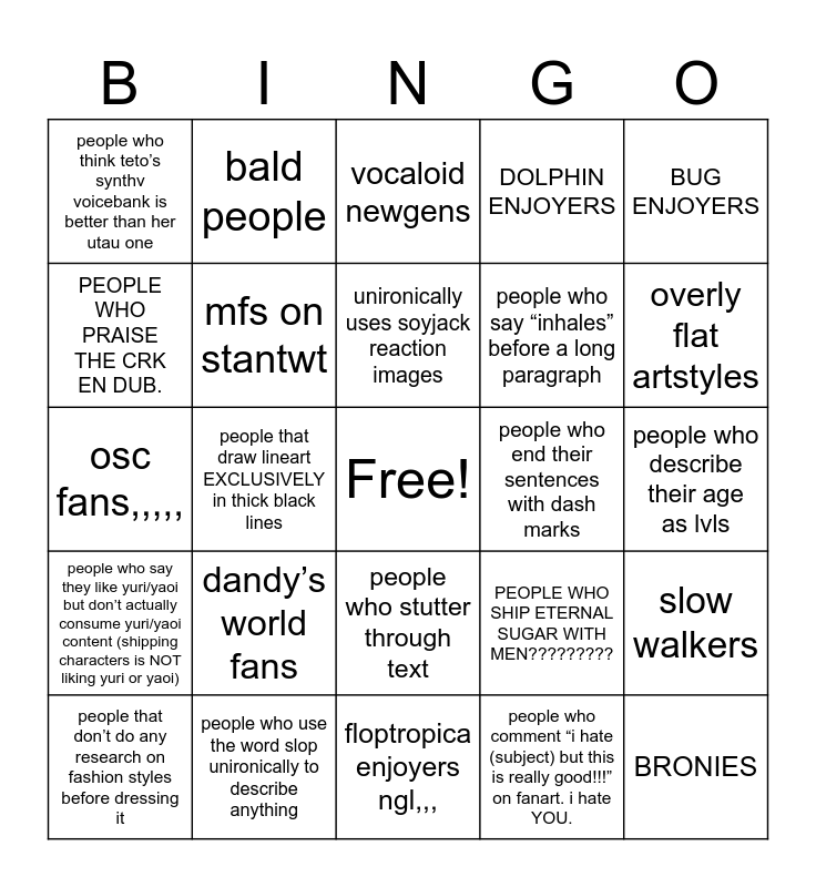 This bingo card has a free space and 24 words: dandy’s world fans, people who use the word slop unironically to describe anything, unironically uses soyjack reaction images, people that don’t do any research on fashion styles before dressing it, BUG ENJOYERS, people who think teto’s synthv voicebank is better than her utau one, PEOPLE WHO PRAISE THE CRK EN DUB., bald people, people who end their sentences with dash marks, people who stutter through text, people who say “inhales” before a long paragraph, osc fans,,,,,, PEOPLE WHO SHIP ETERNAL SUGAR WITH MEN?????????, slow walkers, mfs on stantwt, people who comment “i hate (subject) but this is really good!!!” on fanart. i hate YOU., people who describe their age as lvls, vocaloid newgens, overly flat artstyles, people that draw lineart EXCLUSIVELY in thick black lines, BRONIES, people who say they like yuri/yaoi but don’t actually consume yuri/yaoi content (shipping characters is NOT liking yuri or yaoi), DOLPHIN ENJOYERS and floptropica enjoyers ngl,,,.