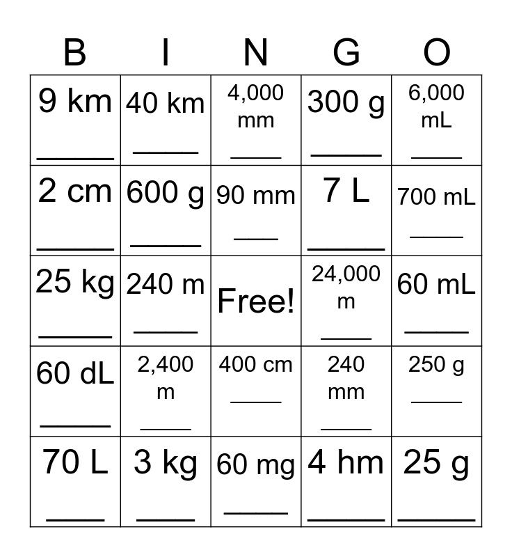 This bingo card has a free space and 24 words: 2,400 m ____, 3 kg ___, 90 mm ___, 70 L ___, 6,000 mL ____, 9 km ____, 2 cm ____, 40 km ____, 24,000 m ____, 400 cm ____, 7 L ____, 25 kg ____, 240 mm ____, 250 g ____, 600 g ____, 4 hm ____, 60 mL ____, 4,000 mm ____, 700 mL ____, 240 m ____, 25 g ____, 60 dL ____, 300 g ____ and 60 mg ____.