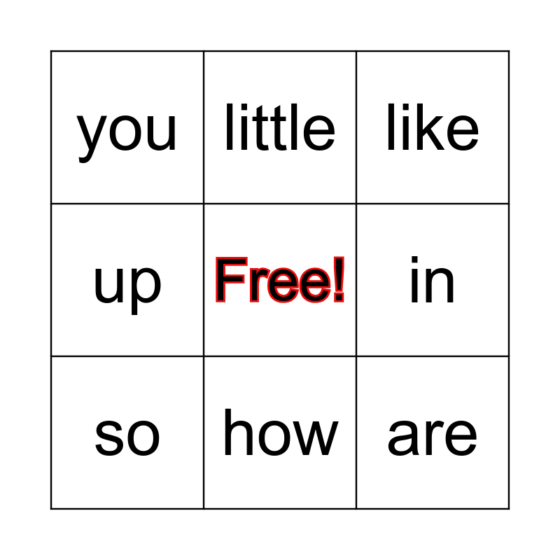 This bingo card has a free space and 11 words: where, how, are, so, little, like, in, the, up, you and I.