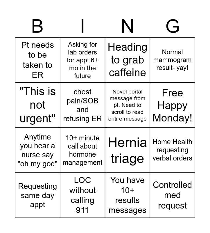 This bingo card has 18 words: 10+ minute call about hormone management, Controlled med request, Heading to grab caffeine, Pt needs to be taken to ER, Hernia triage, Normal mammogram result- yay!, Requesting same day appt, Asking for lab orders for appt 6+ mo in the future, Free Happy Monday!, Anytime you hear a nurse say "oh my god", You have 10+ results messages, "This is not urgent", Home Health requesting verbal orders, chest pain/SOB and refusing ER, Novel portal message from pt. Need to scroll to read entire message, PA message for GLP1 med, LOC without calling 911 and MA delegates to RN a non-nursing task.
