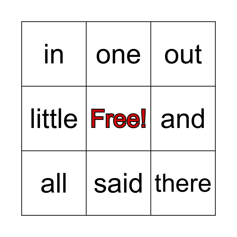 This bingo card has a free space and 11 words: were, said, there, all, one, out, and, they, little, in and the.
